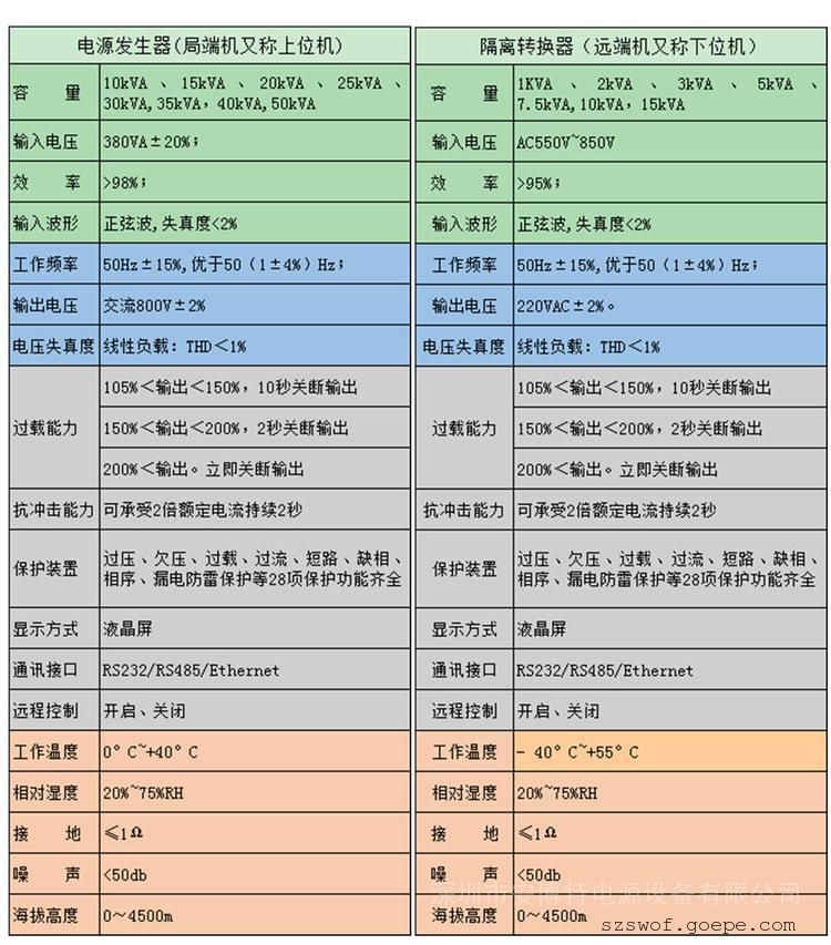 电源变换器的负载能力从0.5KVA到10KVA(必要时可以提供20KVA),电源发生器的容量从10KVA到30KVA(必要时可以提供50KVA),且 供电距离超过20公里。