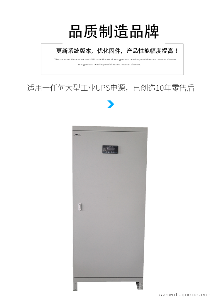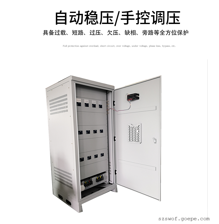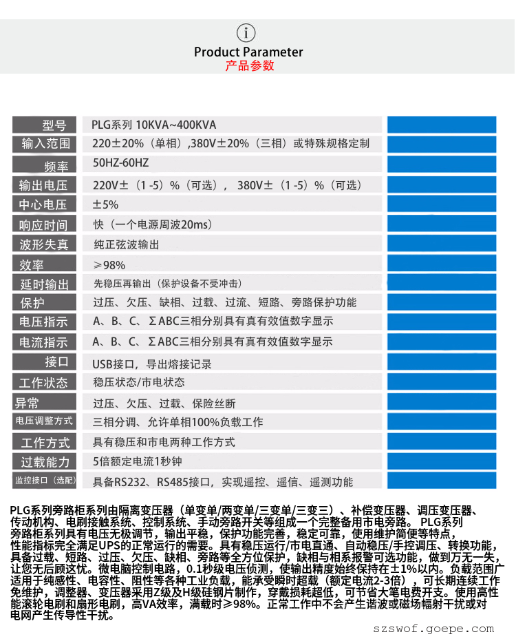 品牌:安博特(ABOT) 型号:UB 加工定制:是 应用范围:电源 铁心形状:EI型 频率特性:中频 电源相数:三相 冷却形式:干式 铁心形式:壳式 绕组形式:三绕组 防潮方式:开放式 冷却方式:油浸风冷式 外形结构:立式 电压比:380v:220v V 频率:50--60 hz 额定功率:30 KVA 产品简介UPS专用旁路稳压柜是一种用于电力,石化,工矿企业的大型UPS不间断电源前端的全自动交流稳压设备。由稳压旁路部分和隔离部分组成,具备自动稳压和手动调节,市电直通,缺相,过流,过压,短路保护等功能。可选双电源自动切换装置。同时也可以广泛使用在大型设备的旁路供电系统。由于UPS本身故障或者负载过载,UPS将会切换到旁路,但市电电网电压下陷、电源浪涌、减幅振荡、电源干扰、电源突波、电源波动、交换瞬变及谐波失真等由市电电源质量差将会对后端设备造成严重危害,甚至无法工作。此时,UPS旁路稳压柜可以解决所有问题。设备已经多次应用在电厂的大型UPS前端,完全满足进口和国产UPS的要求。。功率:10KVA-140KVA 2、产品结构UB系列由隔离变压器(单变单/两变单/三变单/三变三)、补偿变压器、调压变压器、传动机构、电刷接触系统、控制系统、手动旁路开关(可选)、直流逆止二极管(可选)、变送器(可选)等组成一个完整备用市电旁路。UB系列具有电压无极调节,输出平稳,保护功能完善,稳定可靠,使用维护简便等特点,性能指标完全满足UPS的正常运行的需要。3、技术参数基本指标?容量10KVA~120KVA ?输入电压380V±15%(三相)?输出电压220V±2%(单相)380V±15%(两相)?稳压精度出厂设定2%(1%~5%可调) ?频率50HZ/60HZ ?响应时间:0.1S ?输出要求: 连续输出,无任何中断时间?带载性能: 在环境温度40℃下,满负荷正常运行,能够承受10倍额定输出电流10秒保护功能?过压输出超过额定电压15%(可调整),立即切断输出电源?欠压输出低于额定电压时,不断电、可相应降低精度?短路当负载设备短路时,不切断输出、直至空开跳闸切断输出电源?逆相无?缺相无其它指标?输出功率因数0.8 ?输入输出隔离性能: 初次级耐压测试2500VAC/分无击穿、无飞弧现象?整机绝缘性能输入\输出端子对地(GND)500V时>5MΩ ?附加波形失真≤1% ?附加电压不对称度输出对输入不对称增量≤1% ?杂讯≤55dB ?效率容量<40KVA ≥94% 容量40KVA~100KVA ≥96% 容量>100KVA ≥98% ?绝缘等级B级(F级可定制) ?耐压稳压部分对地2000VAC/分无击穿、无飞弧现象隔离变压器部分对地2500VAC/分无击穿、无飞弧现象?环境温度0~45℃相对湿度20%~90% 4、、性能特点1)具有稳压运行/市电直通、自动稳压/手控调压、转换功能;2)具有手控控开停/自动开机、延时关机/延时输出、可选用功能;3)使用高性能滚轮电刷;4)具有过压、欠压、过载和短路保护,缺相与相系报警可选功能;5)能适应感性、容性、阻性各种负载,可长期连续工作;6)能承受瞬时超载(额定电流2-3倍)。部分业绩:(排名不分先后)华莹山电厂脱硫: 30KVA -